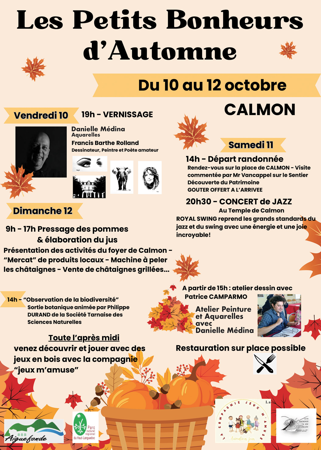Du 10/10 au 12/10 à Calmon Vend. 10 : Vernissage expo 19h Sam. 11 : Randonnée 14h / Concert Jazz 20h30 au Temple Dim. 12 : Marché producteurs + pressage des pommes 9h-17h - Sortie botanique 14h - Ateliers peinture 15h Lire la suite